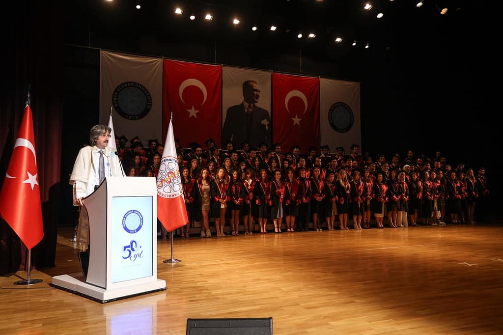 “Bu yıllar, hayatınızda her zaman özlemle hatırlayacağınız dönüm noktaları olacak. Üniversitemizi tercih ettiğiniz için her birinize ayrı ayrı teşekkür ediyorum. Mezuniyetinizle birlikte yeni bir hayata adım atıyorsunuz. Sizlere bundan sonraki yaşamınızda sağlık, mutluluk ve başarı diliyorum. Bursa Uludağ Üniversitesi diplomasının sizlere iş hayatınızda önemli katkılar sağlayacağına inanıyorum. Yolunuz ve bahtınız açık olsun.”