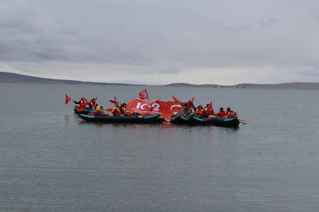 Çıldır Gölü üzerinde düzenlenen kano etkinliğinde, Çıldır Belediyesi Su Sporları Kulübü üyesi çocuklar Türk ve Azerbaycan bayraklarıyla gölde gösteri yaptı.