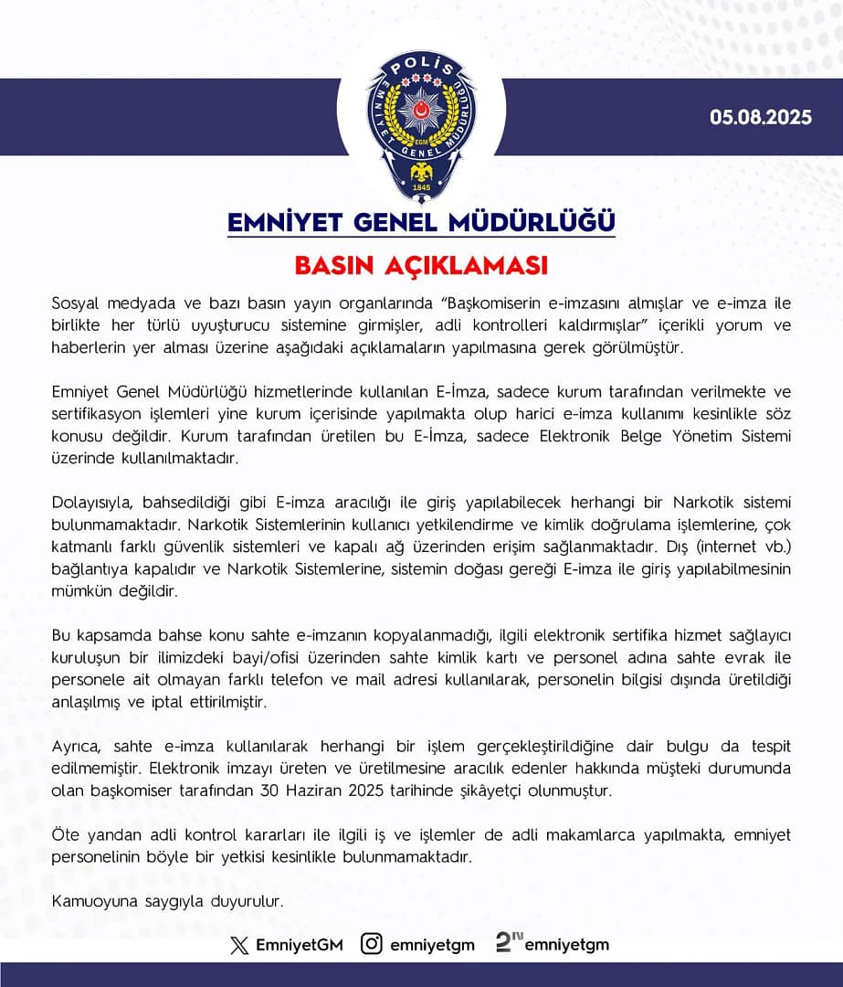 Özellikle narkotik sistemleri gibi hassas veri barındıran altyapıların çok katmanlı güvenlik önlemleriyle korunduğu ve dış bağlantılara tamamen kapalı olduğu vurgulandı. Bu sistemlere e-imza ile erişimin teknik olarak mümkün olmadığı açıklandı.