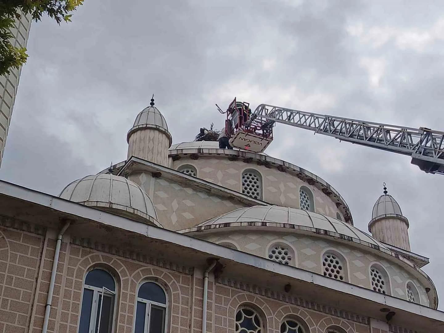 Bursa’nın İznik ilçesine bağlı Orhaniye köyünde cami kubbesindeki yuvasında mahsur kalan leylek, Bursa Büyükşehir Belediyesi İtfaiye ekipleri tarafından gerçekleştirilen üçüncü kurtarma girişiminde sağ olarak indirilebildi. Leyleğin yuvasında ayağı kırık şekilde mahsur kalması köylüleri de harekete geçirdi.