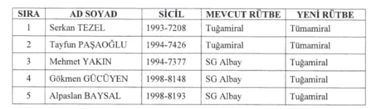Sahil Güvenlik Komutanlığı cephesinde ise 2 tuğamiral, tümamiral rütbesine yükseltilirken, 3 albay da tuğamiral oldu.