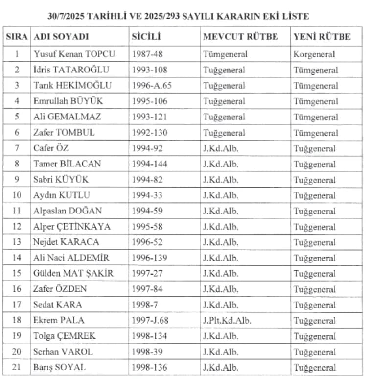 Yeni rütbe ve görev değişikliklerine ilişkin tüm detaylara Resmî Gazete üzerinden erişilebileceği bildirildi. Terfi edilen personelin isim listesi ve görev yerleri kamuoyuyla paylaşılmaya devam ediyor.