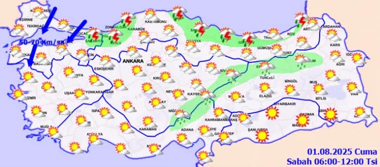 Meteoroloji Genel Müdürlüğü, 1 Ağustos Cuma günü için kuvvetli rüzgâr ve yerel sağanak uyarısında bulundu. Özellikle Ankara, Bolu ve Konya çevrelerinde dikkatli olunmalı.