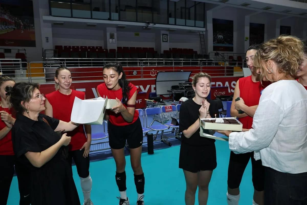 Keyifli geçen ilk antrenmanda Buse Ünal ve fizyoterapist Esin Yılmaz’ın doğum günleri kutlandı. Bu an da takıma moral oldu.