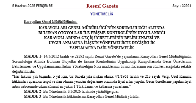 Resmi Gazete’nin bugünkü sayısında yayımlanan yeni yönetmelikle birlikte, otoyol ve erişme kontrollü karayollarında geçiş ücretlerinde otomatik artış uygulamasına geçileceği açıklandı. Karayolları Genel Müdürlüğü’nün sorumluluğunda olan bu yollarla ilgili yeni düzenleme, 2026 yılının başından itibaren yürürlüğe girecek.