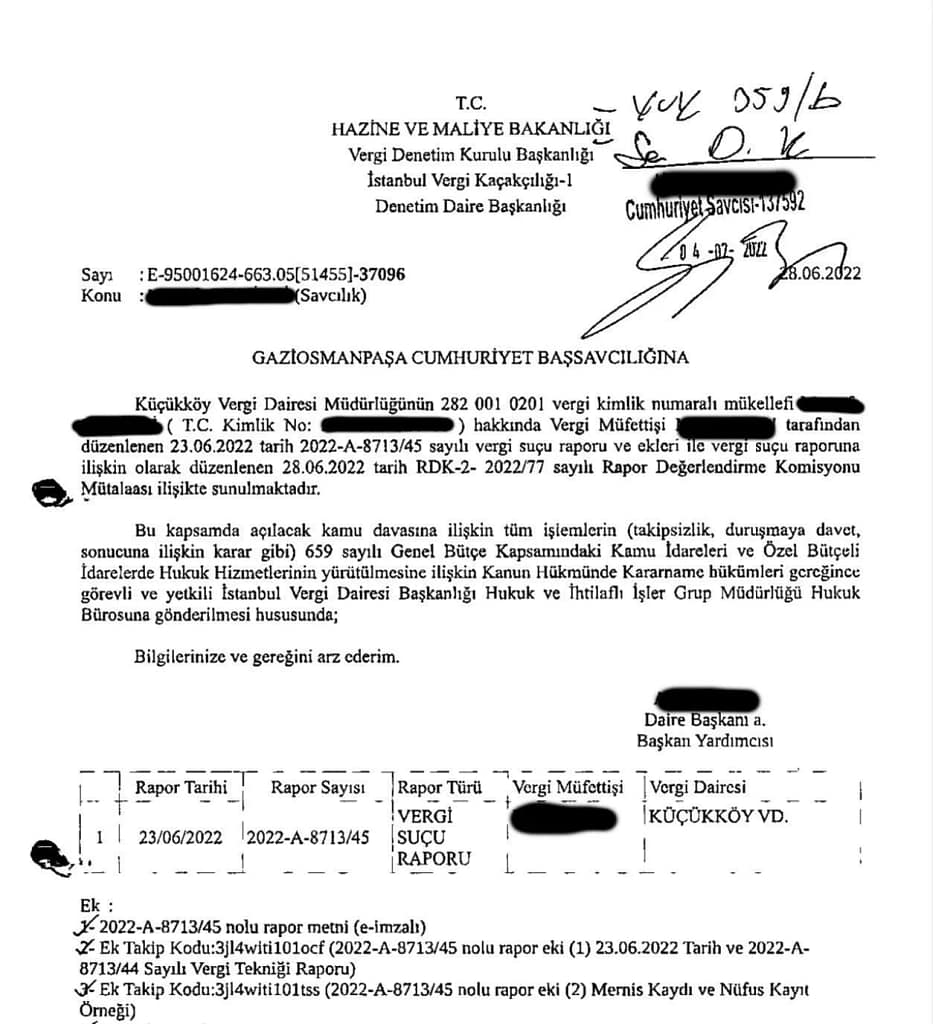 Küçükköy Vergi Dairesi müfettişlerinin raporlarına göre, M.D.’nin gerçeğe aykırı faturalar kullanarak şirketini hileli şekilde iflas ettirdiği tespit edildi. İstanbul 3. İflas Müdürlüğü tarafından yürütülen süreçte, kesilen faturaların gerçek bir mal veya hizmete dayanmadığı belirlendi. Eylemlerin kast unsuru taşıdığı vurgulanarak İstanbul Cumhuriyet Başsavcılığı’na kamu davası talebiyle suç duyurusunda bulunuldu. M.D.’nin sahibi ve ortağı olduğu şirketler için 10’a yakın vergi suçu ve vergi tekniği raporu hazırlandı.