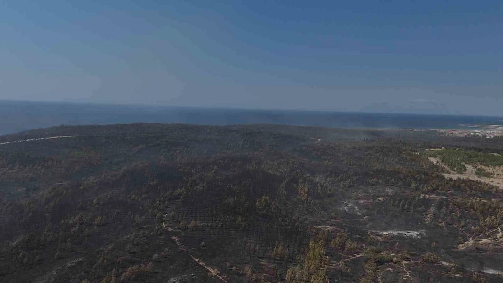 Çok sayıda personel ve iş makinesinin yanı sıra hava araçlarıyla da müdahale edilen yangının kontrol altına alınmasının ardından büyük bölümü çam ormanı olan bölgede yanan alanlar İhlas Haber Ajansı ekiplerince havadan görüntülendi. Yangından geriye kül olmuş ormanların gözyaşlarıyla izlenen havadan çekilmiş görüntüler kaldı.