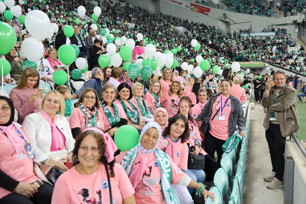 Bursa Büyükşehir Belediyesi, “Meme Kanseri Farkındalık Ayı” kapsamında yaklaşık 100 kadını pembe tişörtlerle Bursaspor-Menemen Belediyespor maçında buluşturdu. Başkan Mustafa Bozbey’in eşi Seden Bozbey de tribünde kadınlarla birlikte farkındalık mesajı verdi.