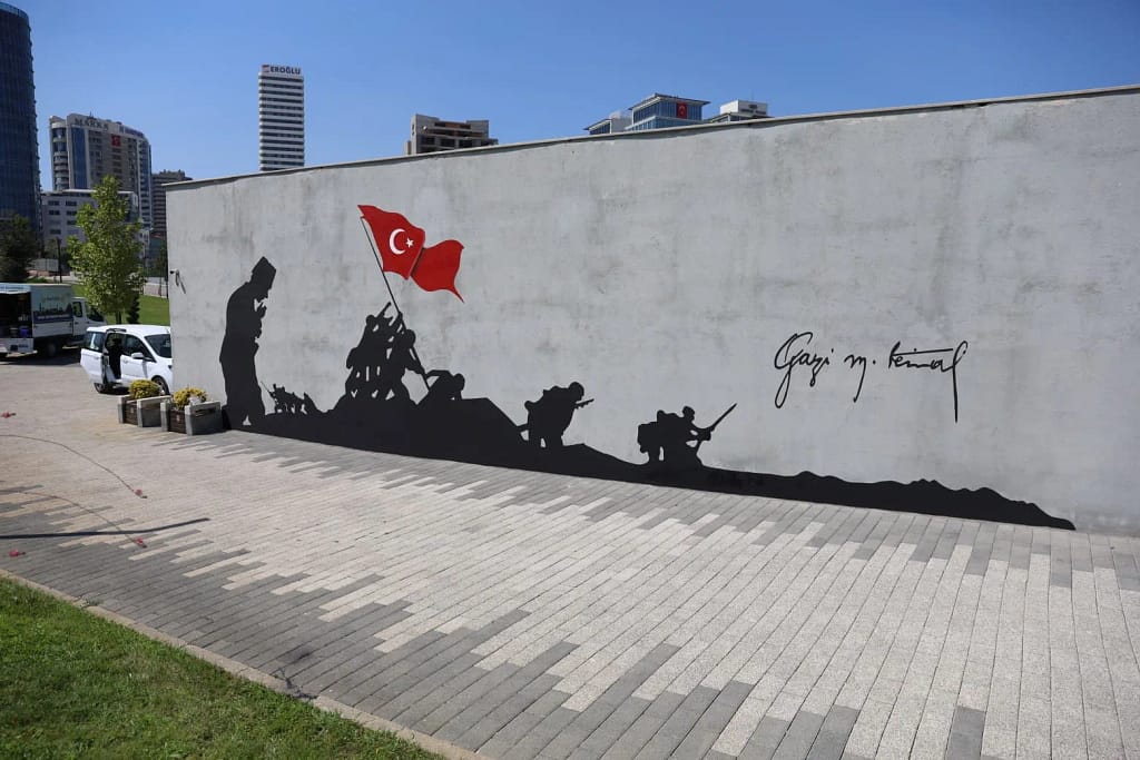 Abidenin giriş yolundaki duvarlara Kent Estetiği Şube Müdürlüğü ressamları tarafından resimler çizilirken, duvar şehit ve gazi yakınları tarafından boyandı. Ellerine boya fırçası olan vatandaşlar, 30 Ağustos’un ruhunu boyalarla duvarlara yansıttı. Türk milletinin bağımsızlık mücadelesi ve Gazi Mustafa Kemal Atatürk’ün ölümsüz mirası estetik bir dille ölümsüzleştirilirken, şehit yakınları ve gaziler tarafından hazırlanan çalışma gelecek nesillere kalıcı bir eser olarak bırakıldı.